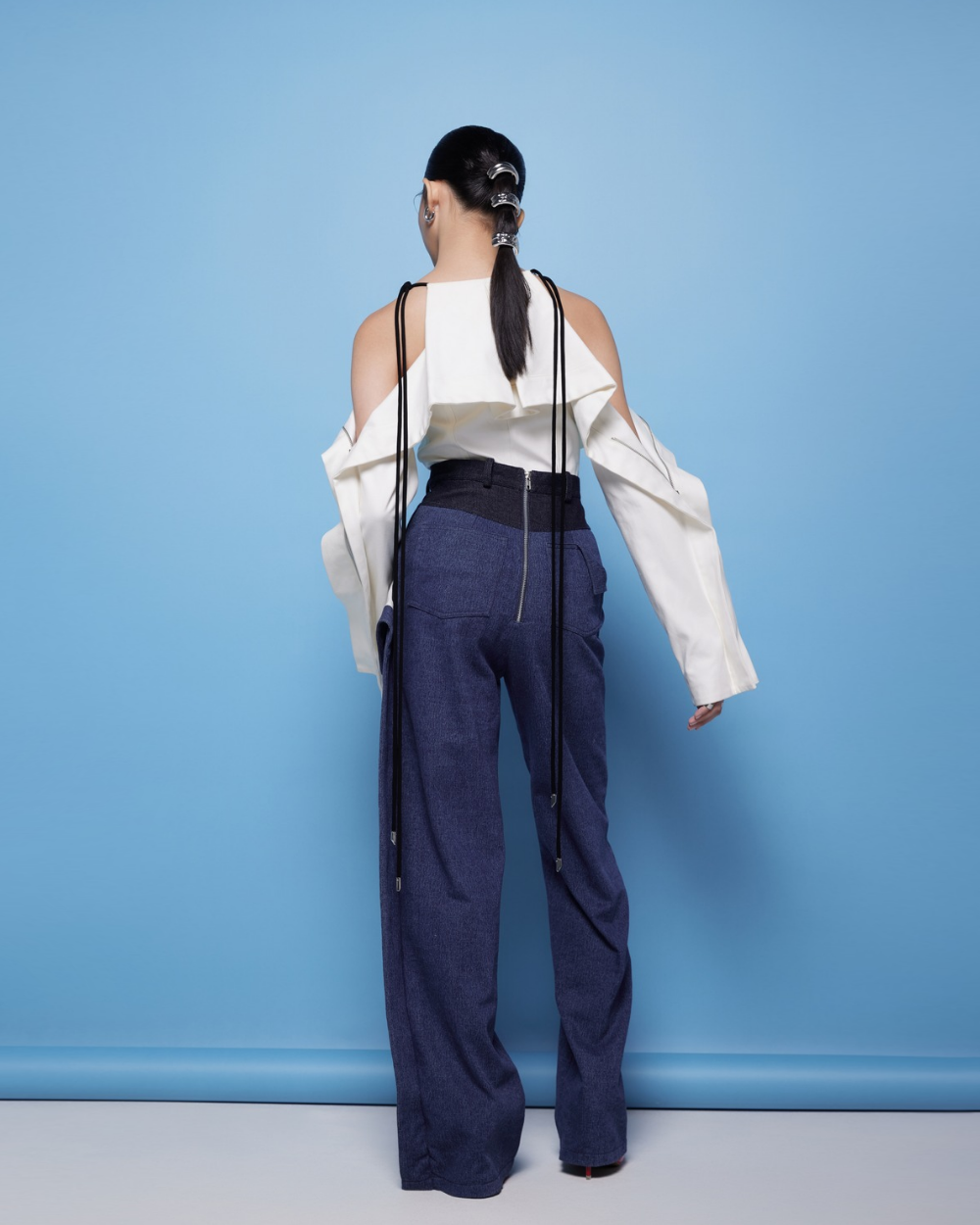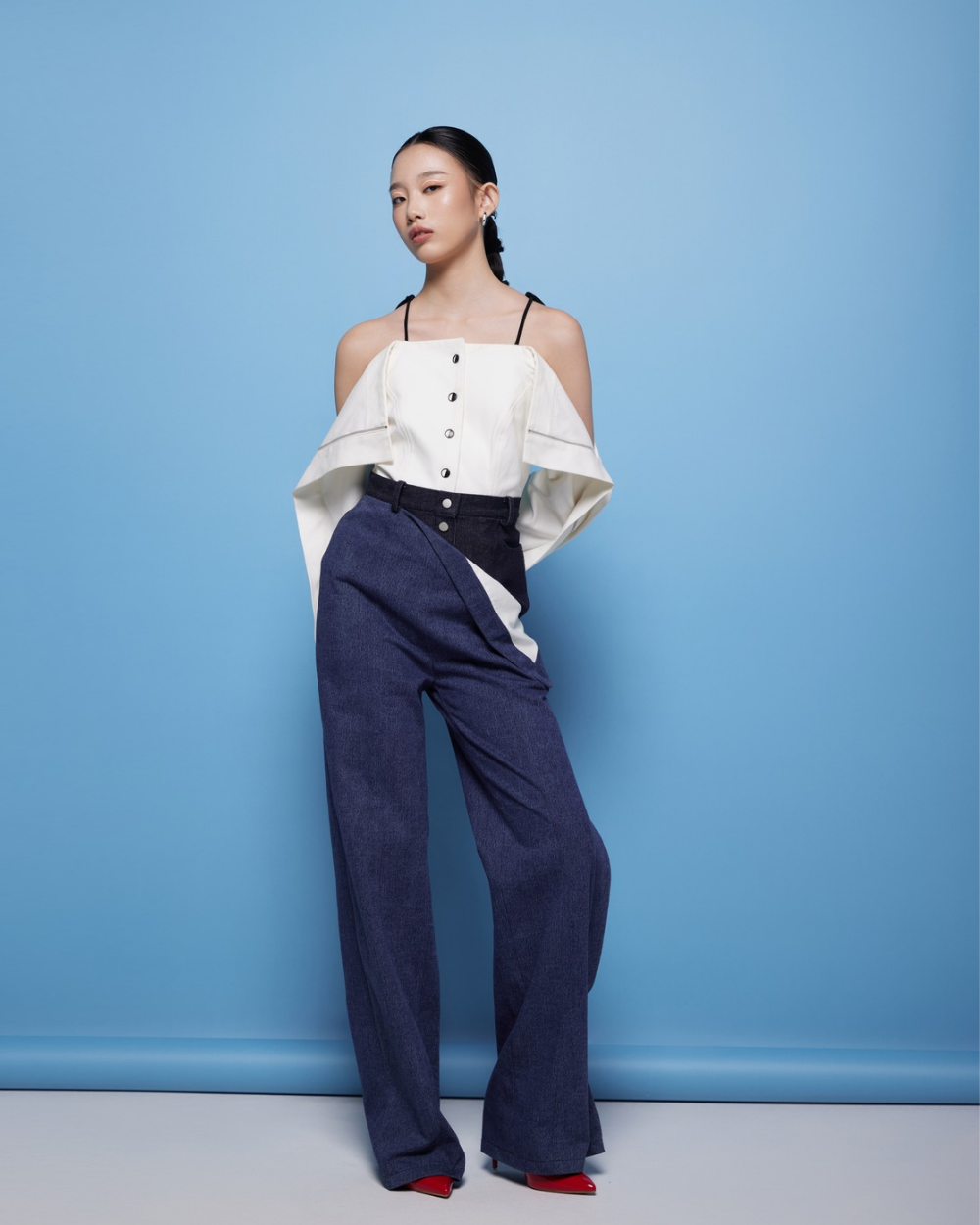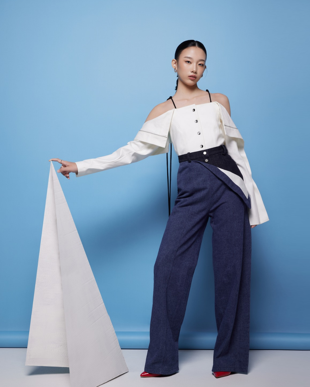 High-waisted, straight-cut pants crafted from layered blue denim. The asymmetrical fold detail adds a distinctive architectural element, enhancing the overall modern aesthetic. Equipped with functional pockets at both the front and back.