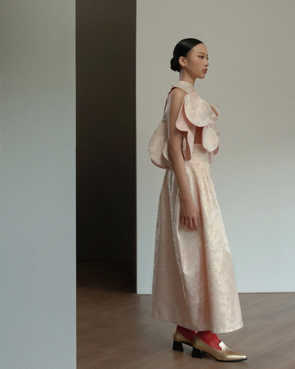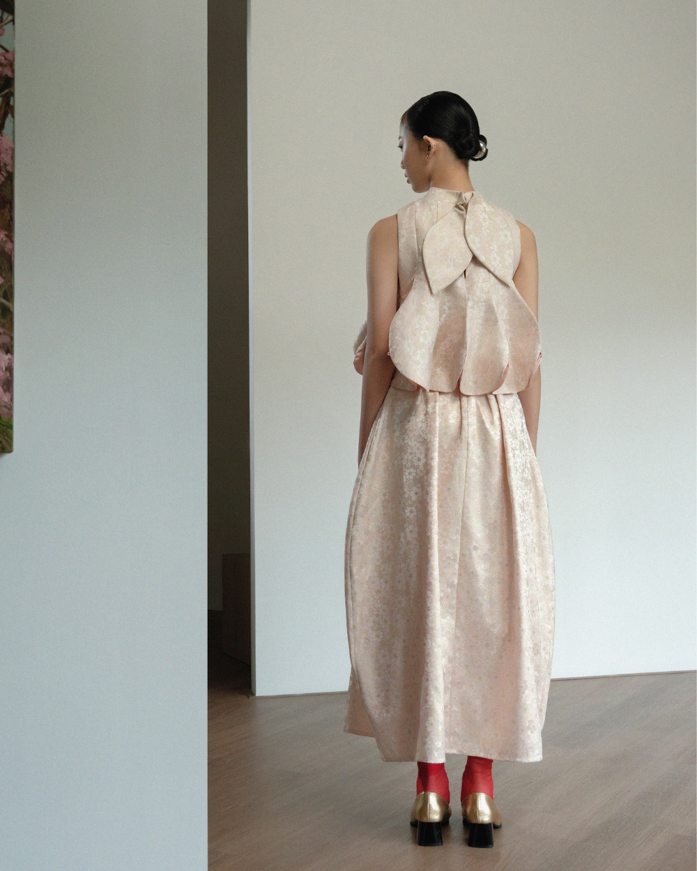 This skirt showcases refined elegance through its jacquard textile, which provides sophisticated visual interest. The high-waisted silhouette creates a flattering, elongated line while the barrel cut establishes a polished, contemporary form. Extended to maxi length, this piece offers versatile coverage suitable for diverse occasions and styling approaches. Best paired with Hana Top or Adsilla Top Pink.