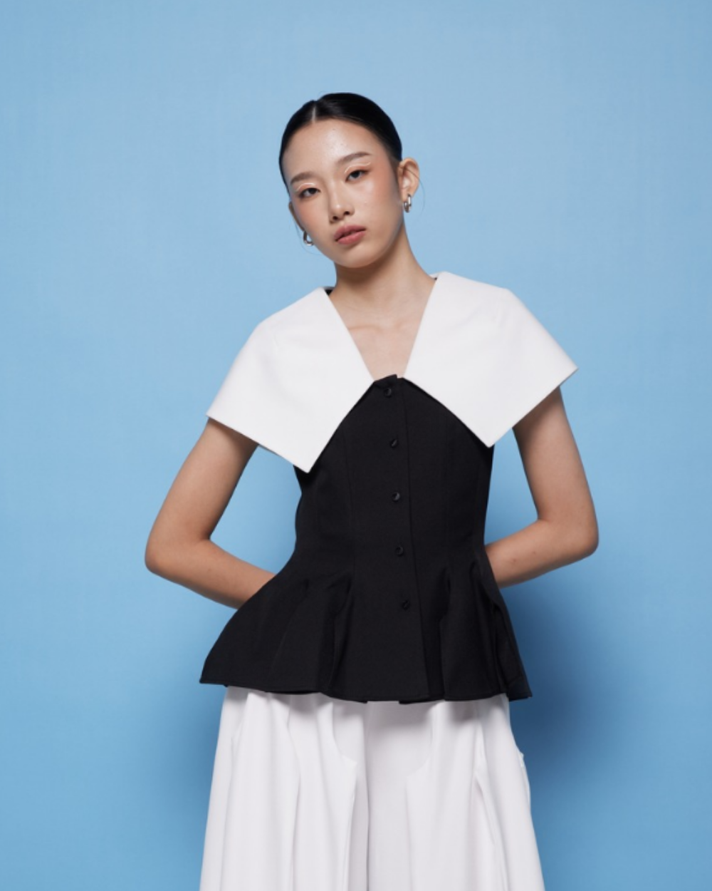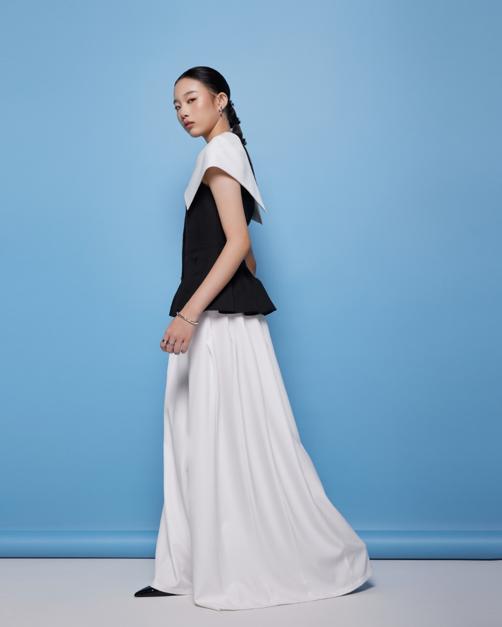 Sleeveless button-down shirt distinguished by its elegant two-tone design and puritan collar. Inspired by cape silhouettes, it features unique 3D panels from the waist to hips that adds architectural depth and defines the silhouette.