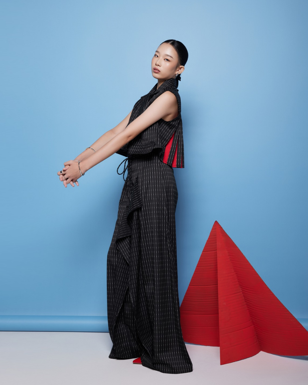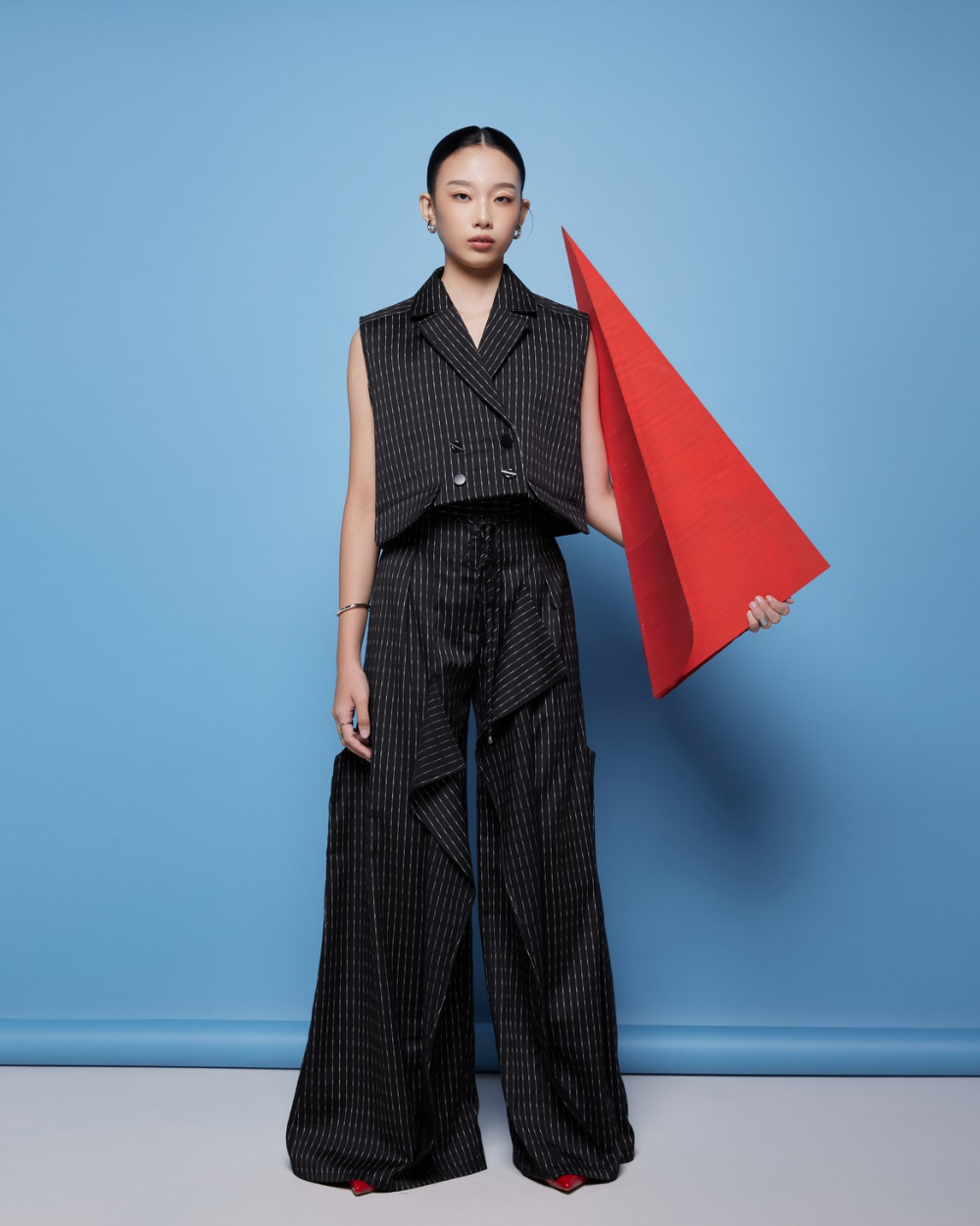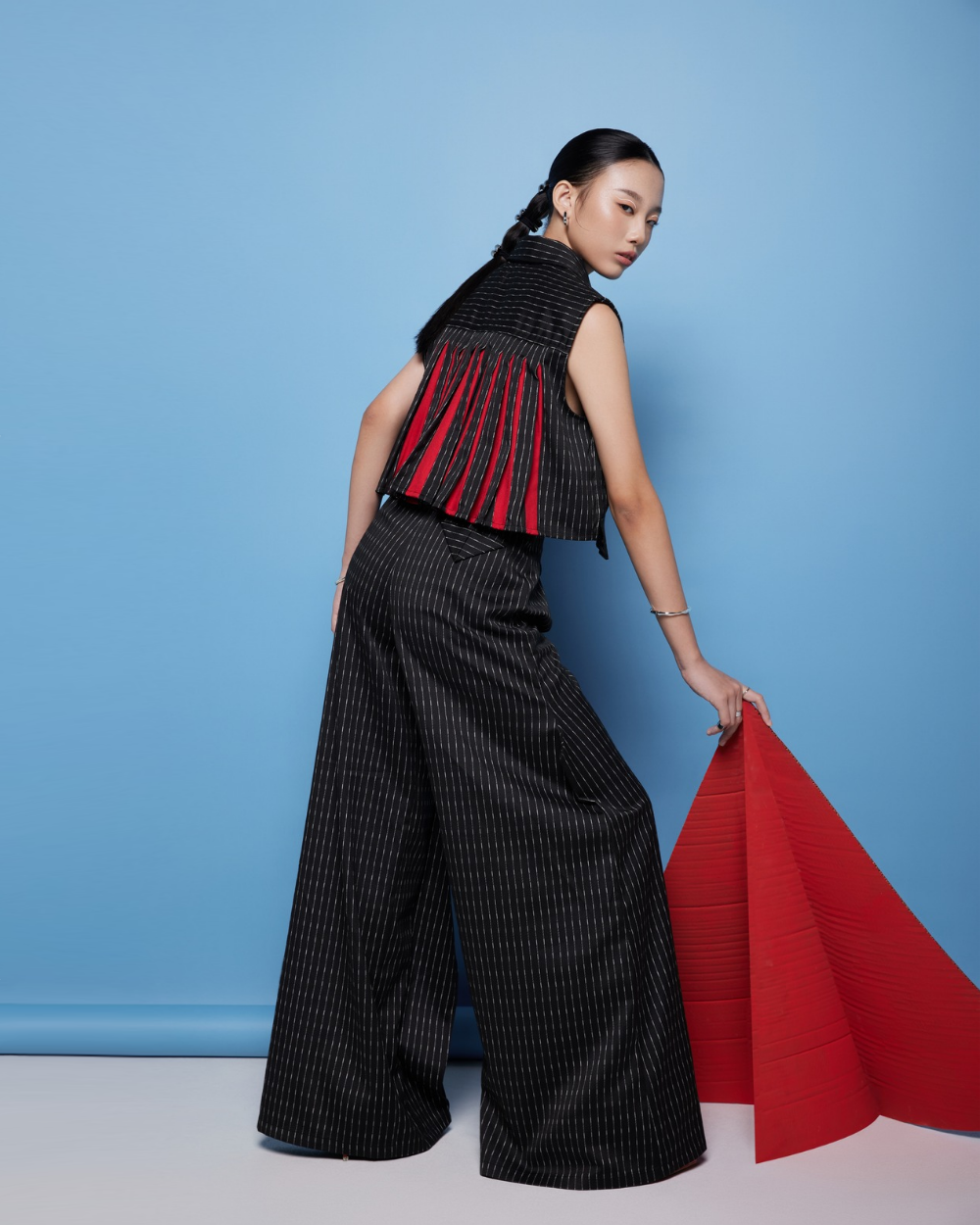 Double-breasted tailor cropped vest with decorative pocket flap at front. Knife pleats detail at back reveals two-tone contrast fabric every time it moves. Best paired with any tailored-cut pants or wear it as a set with Westin pants.