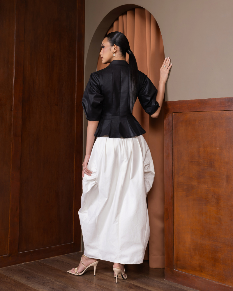 A button-down top with draped sleeves and 3D-panels from waist down to hemline that add architectural depth and define the silhouette.. A fitted top that highlight feminine figure well.