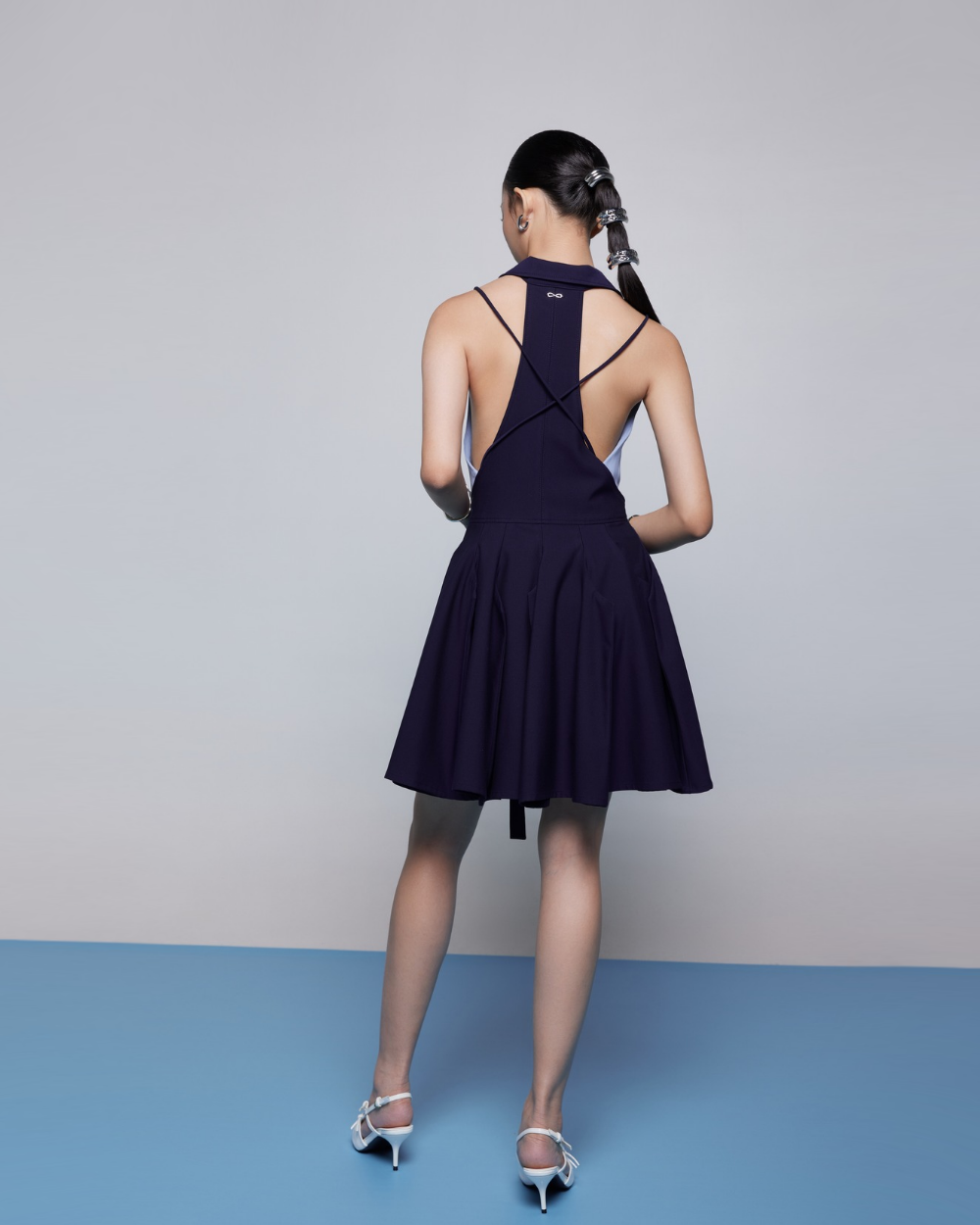 Designed with a button-down front and a sophisticated two-tone color combination, this mini dress features a collared halter neckline and back panel that runs from the back to hemline, which incorporates innovative 3D panels that add architectural dimension and refined structure.