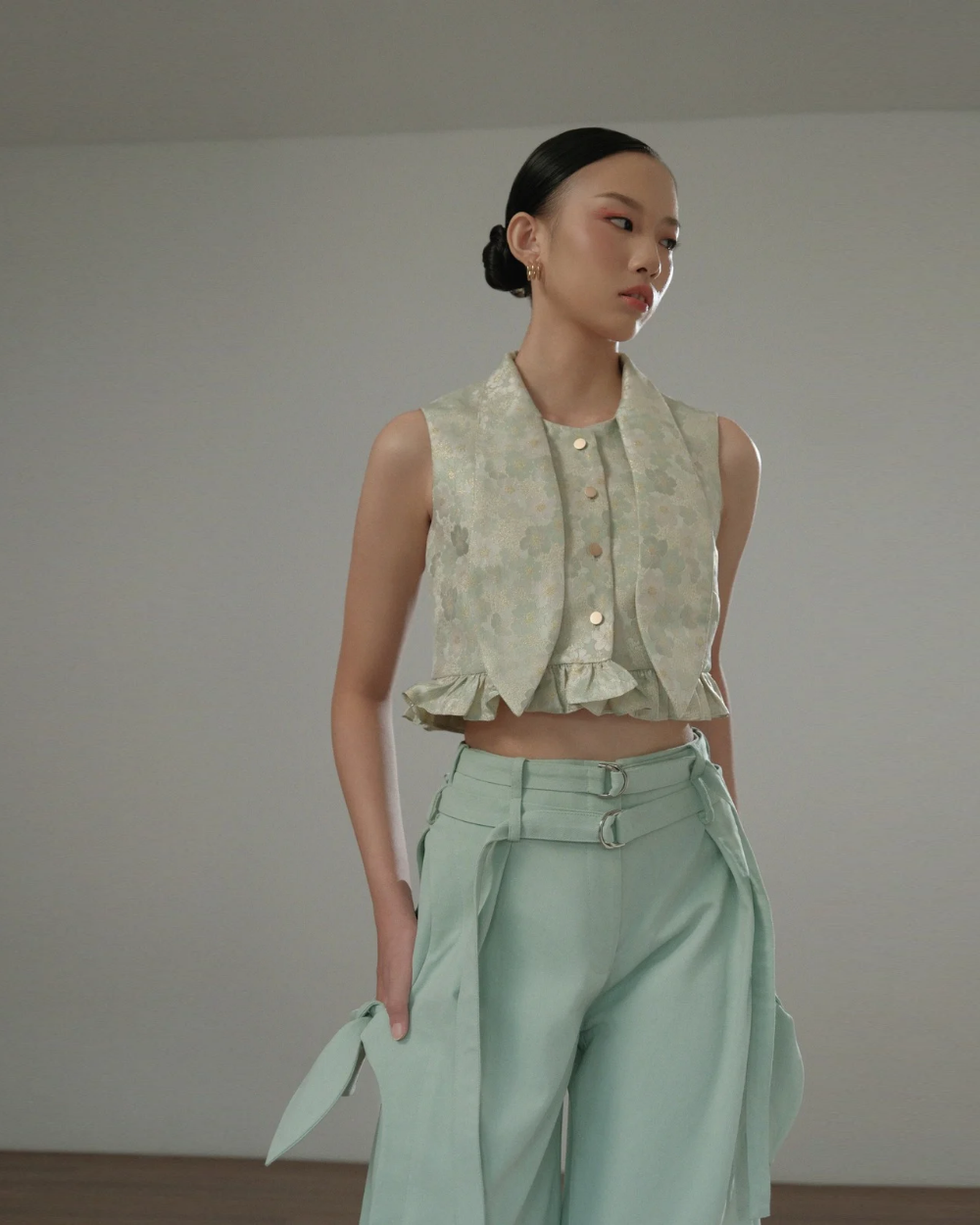 This Bermuda pants feature denim construction with innovative double adjustable and detachable waist straps for a customizable fit. The side ties can be styled.