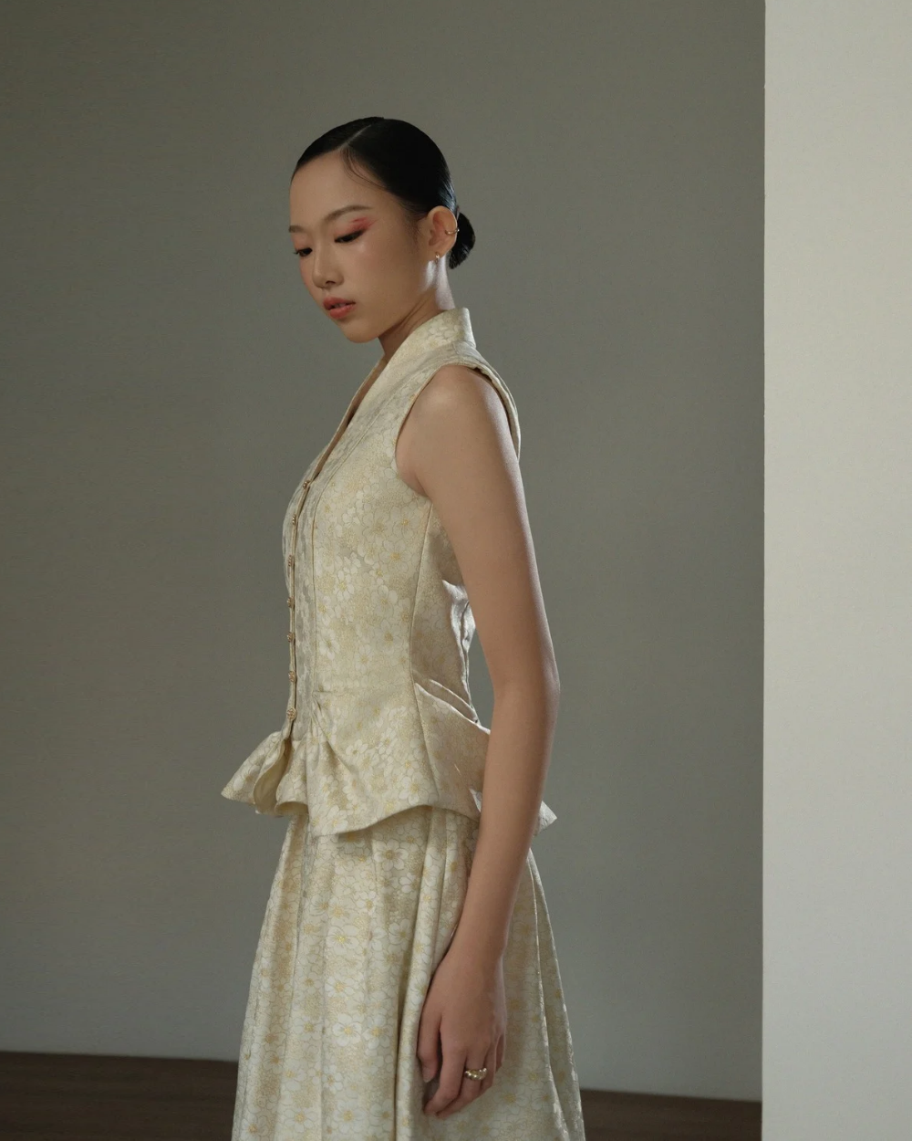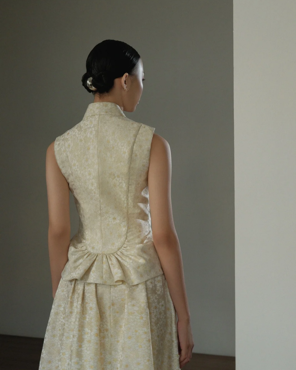 Exemplifying contemporary design through its minimalist sleeveless construction, this top is completed with functional sakura-shaped buttons. The gather details at front and back create subtle sculptural interest while enhancing the garment's drape and silhouette.