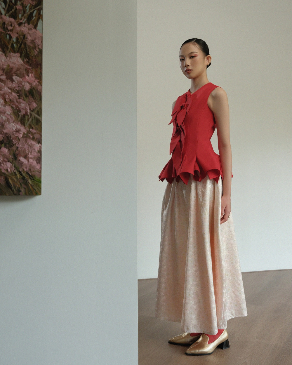 The Viola Top Red combines elegance with innovative construction. A sleeveless design provides clean lines, while multiple ties at the front create dynamic visual layering. Advanced 3D paneling extends from waist through hip, delivering sculpted contouring that enhances natural proportions with precision engineering.